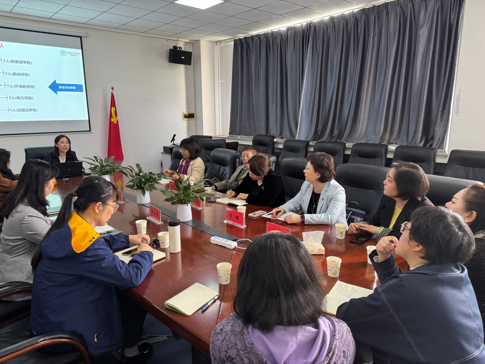 交流会上,沈阳工程学院外语教学部领导班子成员杜薇主任与李岱菊副主任介绍了当前教改背景与时代需求,指出党的二十大报告提出推进高水平对外开放,在此背景下,外语教学改革迫在眉睫。教学部紧跟时代步伐,深入探讨如何将课程思政元素有机融入外语教学,涵盖职业道德与责任、国家意识与家国情怀、团队协作精神、创新能力、能源安全与环保意识等多方面,实现知识传授与价值塑造相统一。同时,还带领我校众位老师参观了该校2024年新建成的四六级口试考点,并分享了口试考点前期筹备和建设的宝贵的经验。随后,刘闯书记分享了该校外语教学部党建工作开展的具体情况,与李继书记一起围绕党组织建设、党员培养等分享经验,共促党建提升。